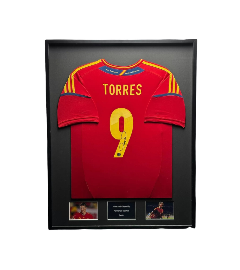 Spanje 11/12 ingelijst thuis shirt gesigneerd door Fernando Torres met certificaat van Exclusive Memorabilia.